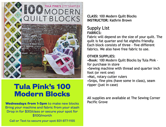 Every Wednesday, join any time or drop in when you can, we’ll offer this class to make 2-4 blocks from October 1, 2025 to January 28, 2026, we’ll offer this class to make 3-5 different blocks from the popular book 100 MODERN QUILT BLOCKS BY TULA PINK! Learn how to piece the blocks and how to use color value to get the most out of showing off each block.